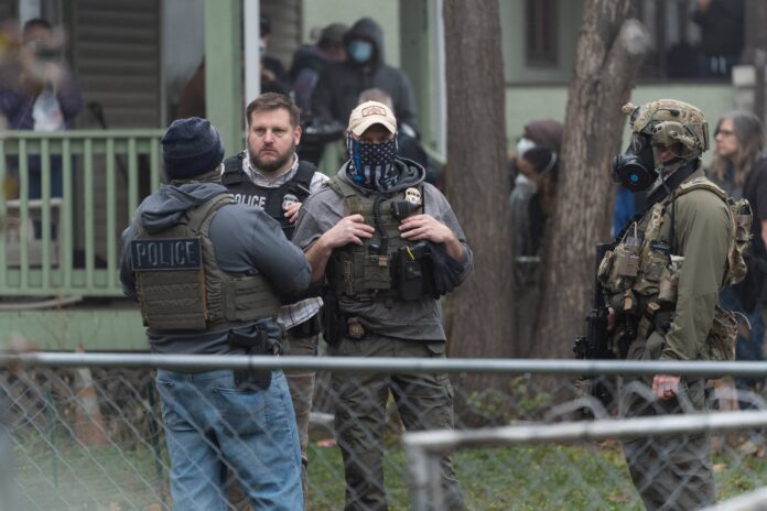 Federal officers from ICE and other agencies stand guard during an immigration raid of a home in St. Paul, Minnesota, on Nov. 25.