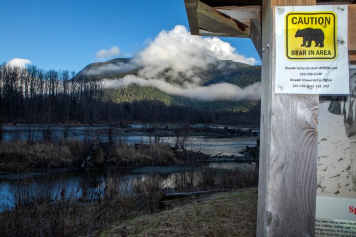 A sign warning of a bear overlooks the Bella Coola River in B.C. on Monday. Two bears from Bella Coola are being assessed, conservation officers said, while two others were captured Monday.