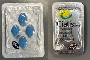 The fake 100 mg Viagra tablets have a printed March 2030 expiry date and no lot number. The phoney 20 mg Cialis pills have an April 2028 expiry date.