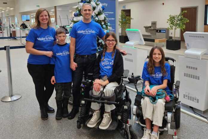 The Nataraj family in the Saskatoon airport prior to boarding a December, 2024 flight. Nataraj and his family recently cancelled a portion of a coming trip because of the size of his daughter Georgia's powerchair, despite flying with the airline previously.